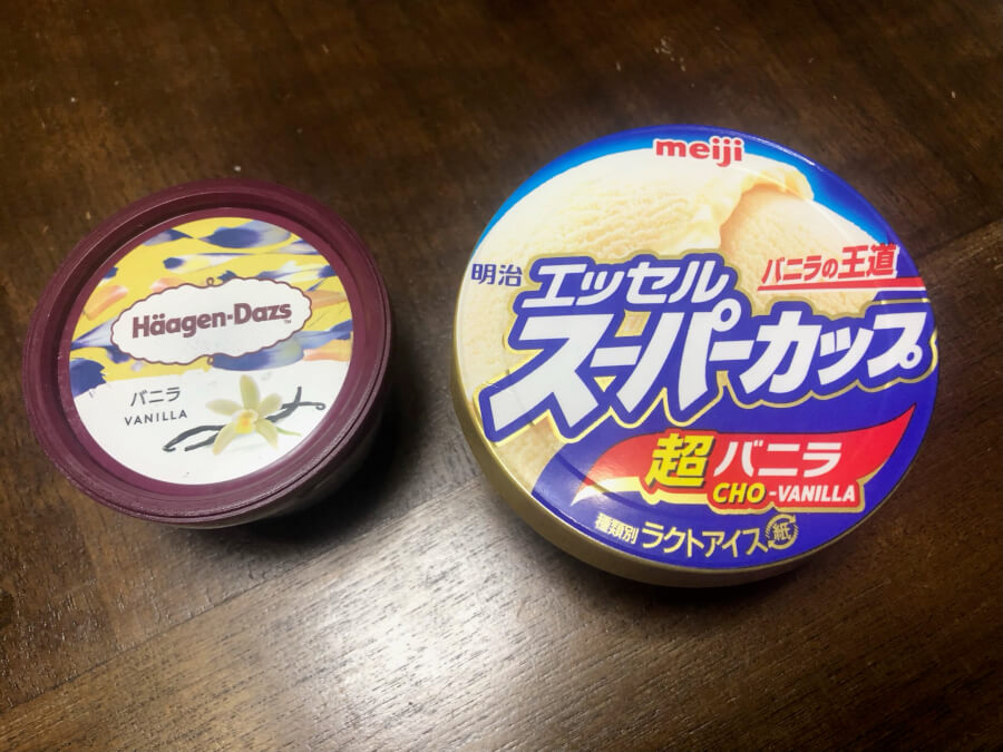 聞くところによるとスーパーカップは【ラクトアイス】と呼ばれるもので、ハーゲンダッツは【アイスクリーム】と呼ばれ口溶けに差がでるようです。なので【アイスクリーム】を2つで利きアイスをやると、より難易度が上がると思います🙋♂️