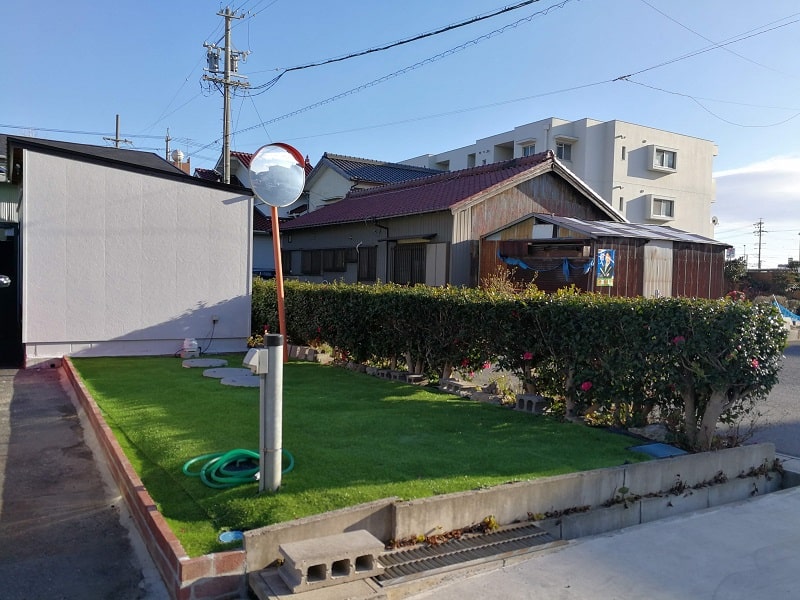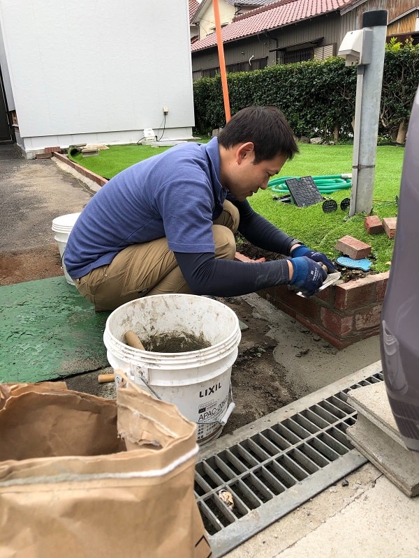 敷地内空き地に敷いた人工芝側面を囲うレンガ設置が完了しました